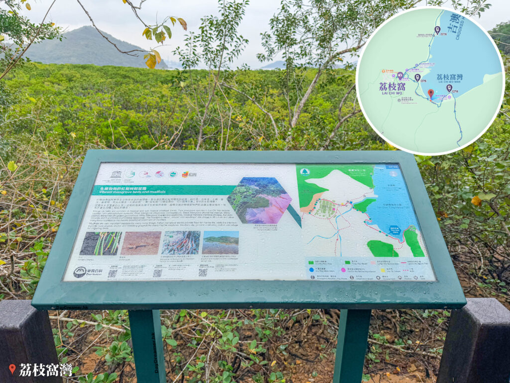【荔枝窩】位於新界東北,是香港世界地質公園的精華所在,擁有生機勃勃的紅樹林和泥灘。這裡記錄了香港全部8種真紅樹,更有罕見的巨型銀葉樹林 及白花魚藤。當地生態多樣性極高,生機勃勃的泥灘棲息著招潮蟹和彈塗魚,是香港珍貴的自然與文化遺產。